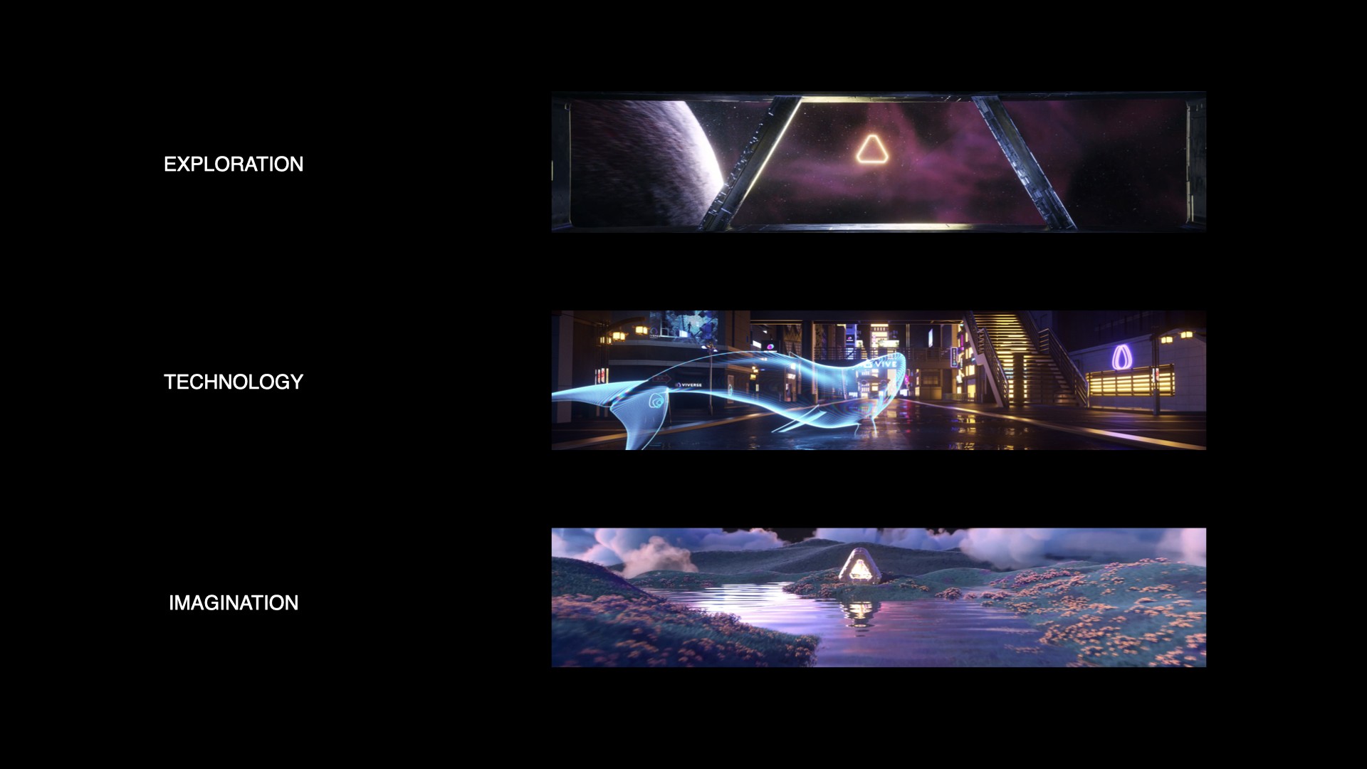Designed as a seamless loop animation for HTC’s curved LED volume, Curve Reality translates the brand’s core pillars into three immersive environments: Exploration, Imagination, and Technology. My objective was to create a continuous visual journey that embodies the HTC spirit while maintaining a captivating presence in a physical space. Beyond the local installation, I collaborated with international engineering teams to adapt the visual for a massive 5-meter high display. By meticulously calculating projection mapping and pixel-perfect restoration, I ensured a consistent, high-fidelity immersive experience that bridged the gap between digital content and large-scale architectural display.